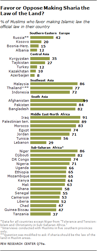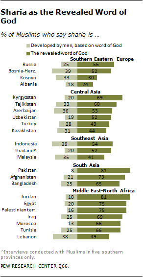 As you can see above, while significant minorities in the Muslim world do not believe that Sharia is the word of God, in every case, more do than do not.